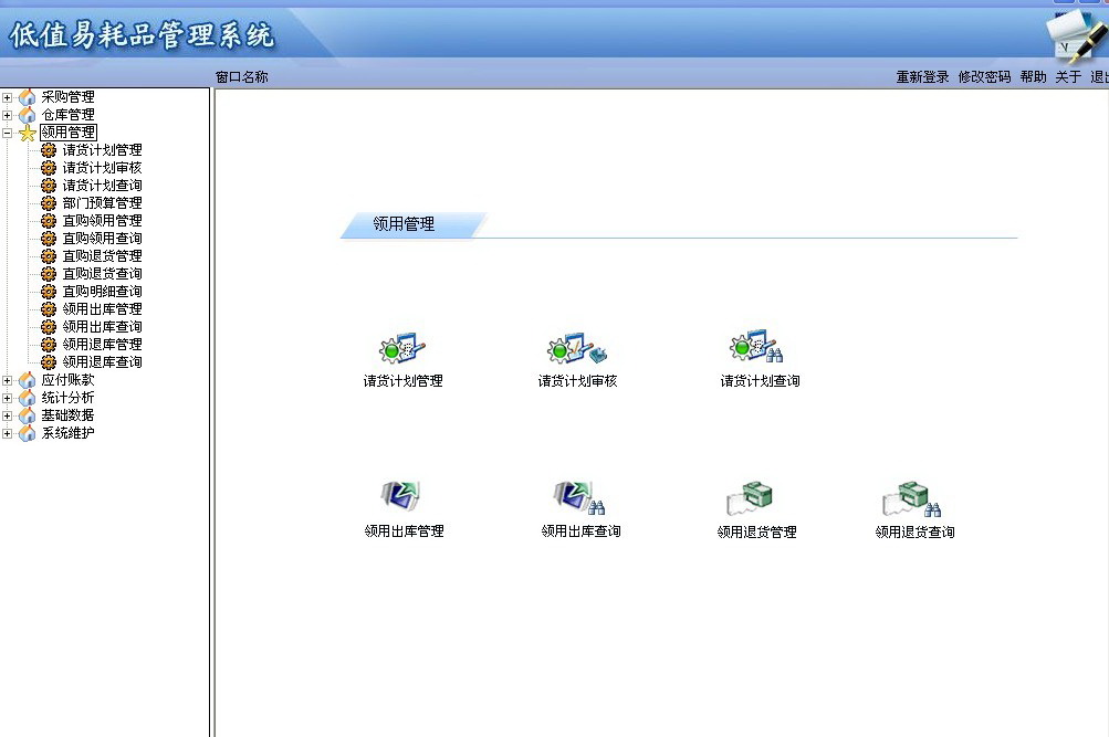 本系统主要是针对企业的易耗品的入库、领用、库存等情况进行管理,完成企业对低值易耗品日常业务的采购入库、退货、领用、退库、盘点、往来账款等管理工作。全面反映易耗品的采购情况、领用情况、损耗情况、以及人员和部门的领用情况。同时借助功能强大的查询及报表功能使管理人员能及时、准确地了解所需信息,为企业的决策提供了正确、便捷的支持平台。帮助企业更有效、更全面地管理低值易耗品。系统功能