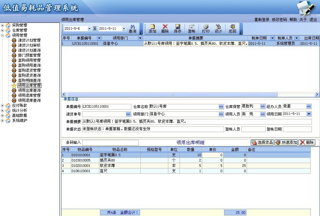 领用出库:提供对易耗品的领用出库管理。