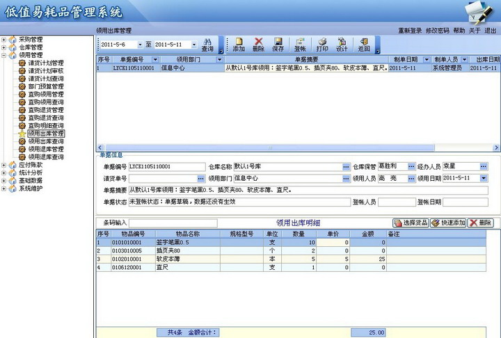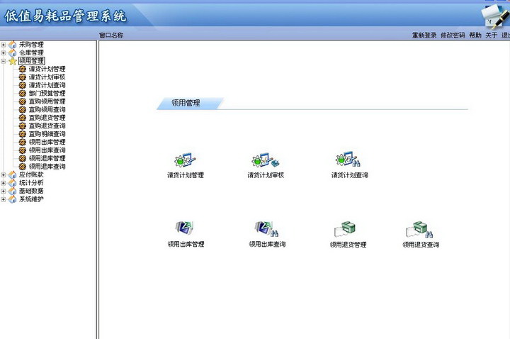 本系统主要是针对企业的易耗品的入库、领用、库存等情况进行管理,完成企业对低值易耗品日常业务的采购入库、退货、领用、退库、盘点、往来账款等管理工作。全面反映易耗品的采购情况、领用情况、损耗情况、以及人员和部门的领用情况。同时借助功能强大的查询及报表功能使管理人员能及时、准确地了解所需信息,为企业的决策提供了正确、便捷的支持平台。帮助企业更有效、更全面地管理低值易耗品。