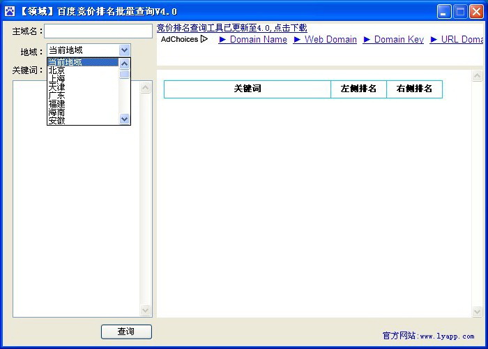 3楼 华军网友 2022-02-06 14:35:58下载领域百度竞价排名批量查询工具中,真心不错!!!