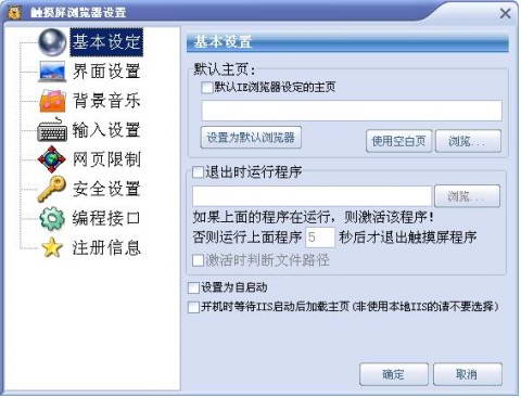 可自定义关机时间其它安全设置:一直在顶部、禁止屏幕保护、禁止右键弹出菜单、屏蔽Ctrl+Alt+Del、屏蔽其它热键方便触摸屏浏览器退出,有两种退出模式进行选择,提供退出密码保护,防止用户误操作而退出触摸屏浏览器软件。