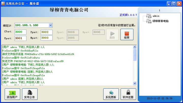 1.布署极为方便。绿柳青青无纸化办公室(Paper Less Office System 以下简称PLOS)属于典型的C/S模式的软件,安装服务端的计算机不需要配置成WEB、FTP等标准服务器,任何一台电脑,都可以是服务器。PLOS系统通过侦听本机的相关端口,即可接受其他机器(包括本机)的连接信息,从而达到做为服务器的功能。一台电脑,可以是服务器,同时也可以安装客户机。大大方便了PLOS的调试和布署。
