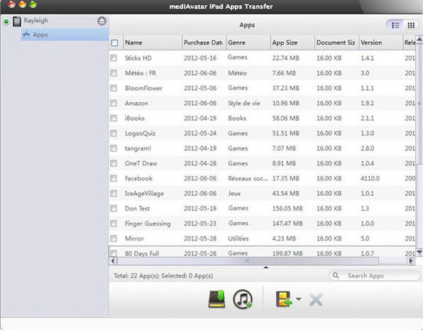 1楼 华军网友 2015-12-11 10:10:33mediAvatar iPad Apps Transfer for Mac很好用,谢谢啦!!