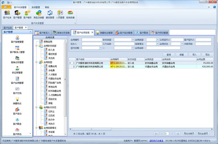 2)客户管理:包括客户信息管理、客户联系人管理、竞争对手管理、供应商管理、客户合同管理、客户文档等信息管理。支持客户资料的批量导入、支持多联系人管理、支持客户名称的排重、支持多条件搜索。支持客户资料、联系人资料的修改、删除权限的控制。