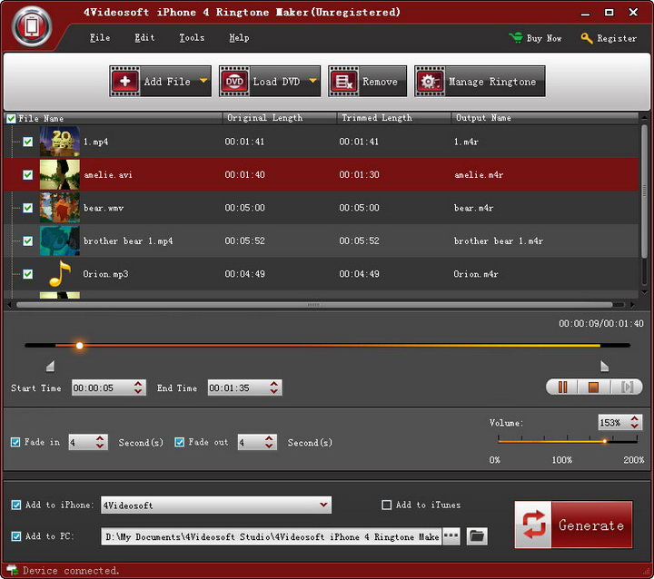 2楼 华军网友 2018-07-03 05:07:234Videosoft iPhone 4 Ringtone Maker界面设计很容易上手,功能很丰富,本人极力推荐!
