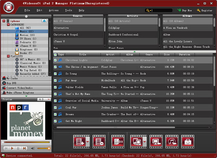 3楼 华军网友 2014-09-10 02:15:514Videosoft iPad 2 Manager Platinum功能全面,使用也挺方便的。