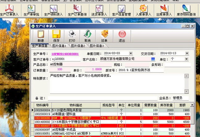 1.物料信息设置可保存图片信息,并在生产订单录入时自动带出。