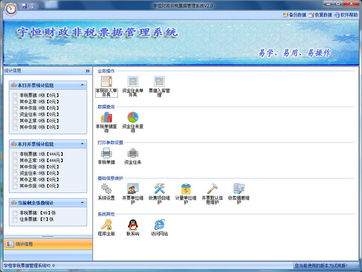 1楼 华军网友 2018-08-04 07:09:51宇恒非税收入票据管理系统界面设计很容易上手,功能很丰富,本人极力推荐!