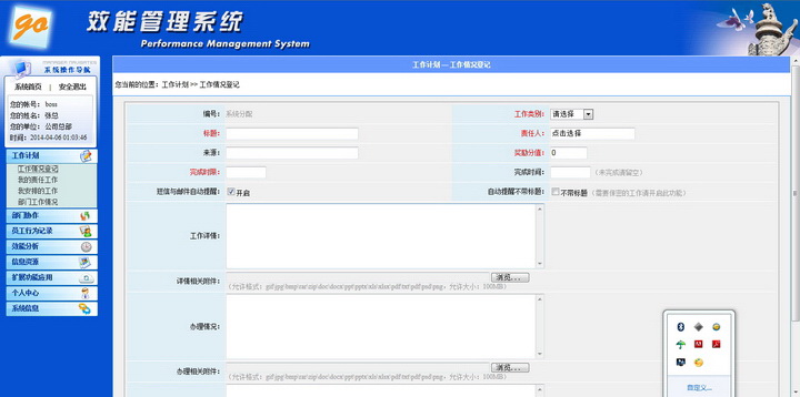 1、工作计划模块。通过该模块管理者可对本部门或下属部门员工安排工作任务,并指定工作奖励分值与完成时限。有新工作任务时系统会自动向相关员工发送短信与邮件通知,并可在工作即将到期的头3天(时间可定义)和当日持续向员工发送工作即将到期的短信与邮件提醒。员工通过系统接收任务并进行办理情况登记直至办结。最终,由管理者对工作完成情况进行总结,按情况给予一定的加扣分。通过该模块进行工作安排与办理,责任目标明确、奖惩有依。补充:员工本人也可以通过系统给自己安排工作,同时可对自己负责的工作创建多个不同周期、内容的短信与邮件提醒计划。
