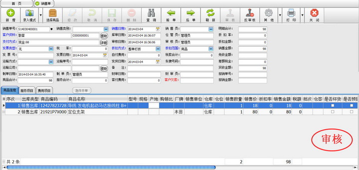 8、销售模块除记录商品的库存销售外,也支持费用项目和服务项目的录入,比如打包费、运输费、安装费等信息,使销售活动尽可能的贴近实际的账目形式。