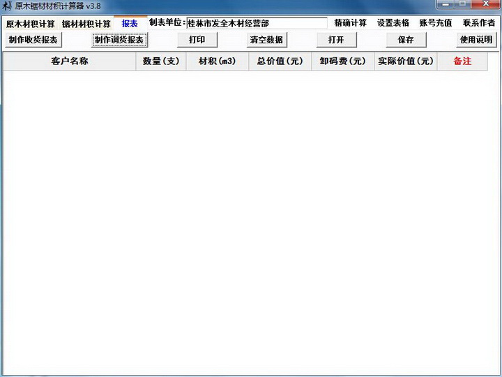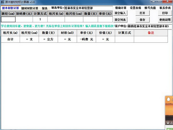7、计算方式:在计算方式中输入1或者0(按快捷键Ctrl自动输入1;按Shift则清除)计算方式为:价格=数量*单价,不按材积立方计算价格(下表计算方式中显示为:支/元),当然材积还是计算在总材积内的;输入其他都是按材积立方计算价值,计算方式为:价格=材积*单价,(下表计算方式中显示为:立方/元);(如:当在计算方式中输入1或者0时,数量输入8;单价输入20;那么回车后下表框价值显示为160);如果计算时输入错误,请在下表的计算方式中直接修改;