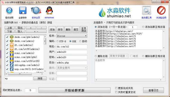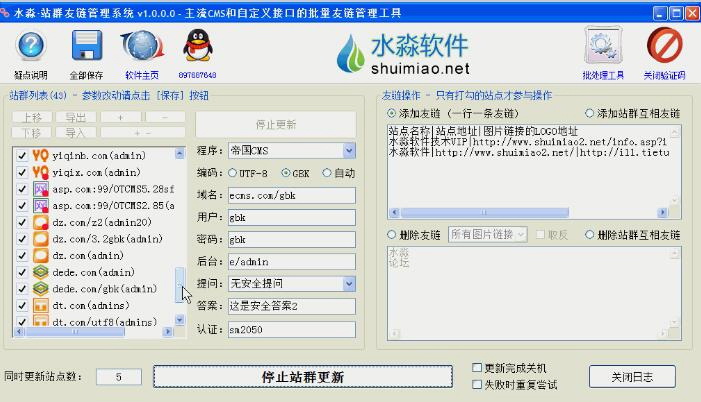 本软件的使用方式类似于水淼的系列站群文章更新器,都是添加好站点列表,全局设置添加或删除友链(作用于所有打勾站点),然后开始站群更新。