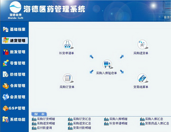 入库验收单药品档案健康异常报表GSP管理首营企业审批货商档案进货明细表采购业务