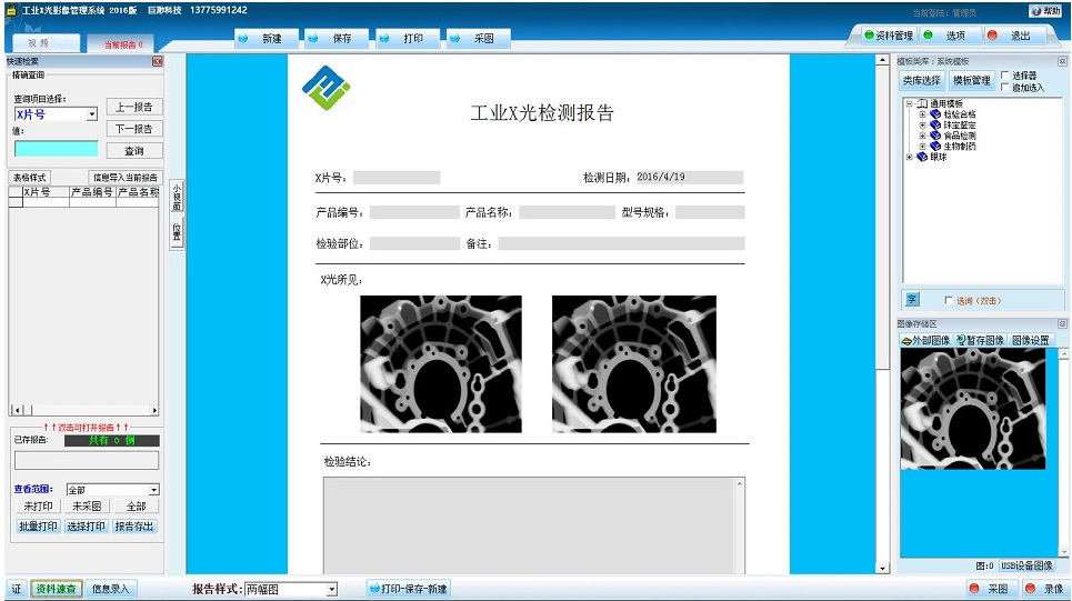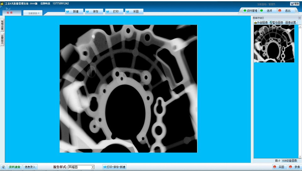 工业X光影像管理系统(巨渺软件),支持各种类型的X光机连接获取图像,对图片进行采集,测量,录像等。可打印检查、检测、信息管理等各种类型自定义报告,方便后期分析、归档,实现对图像,信息资料的存储,管理,查询,统计等,协助您进行更高效、便捷的工业检测。