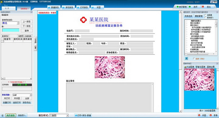 法医病理鉴定管理系统(巨渺软件),支持各种类型的法医病理鉴定仪器设备,通过摄像装置获取镜下图像,对图片进行采集,测量,录像等。可打印检查、检测、信息管理等各种类型自定义报告。实现对图像,病人信息资料的存储,管理,查询,统计等,本系统具有强大的资料检索功能,通过本系统大大提升了信息资料的管理能力。