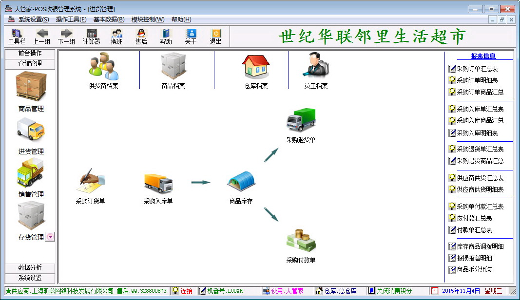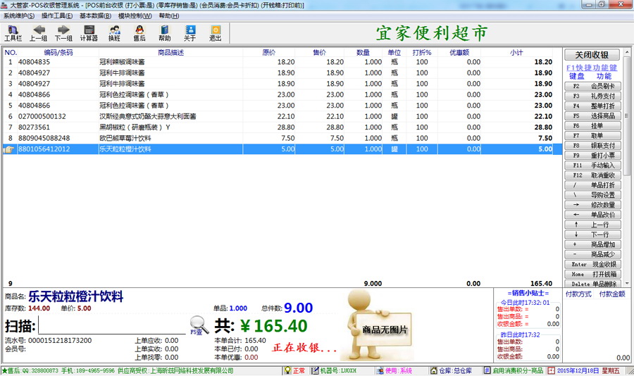 【大管家店铺收银软件】支持商品条形码扫描枪、电子条码秤、电子通讯秤、小票打印机、顾客显示屏、钱箱功能,使用该软件可以方便地进行进、销、存、及收银的管理,会员管理、积分兑换、充值消费、生日提醒、商品保质期、用户权限管理,库存报警提示,报表打印导出,自动备份。主要包括进货、销售(即POS收银,打印小票)、销售退货、存货查询、进货统计、销售统计、利润分析、日月季年统计、导购统计、权限管理、备份还原、交班结算、库存盘点等功能,满足一般店铺的日常经营业务需要。