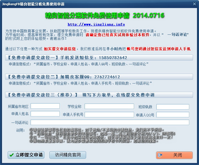 3楼 华军网友 2019-09-16 06:25:06精良分班软件免费申请器(含软件及教程)整体感觉不错,还是挺满意的,安装运行很流畅!按照安装步骤指导来非常顺利!