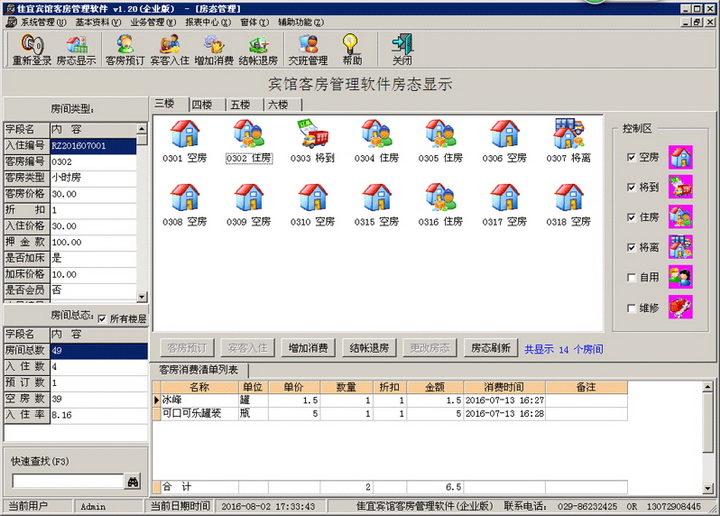 ●“房态显示”登记宾馆客房当前状态和客户入住情况,及时掌握宾馆客房占用情况,方便及时准确的安排客房客房预订。