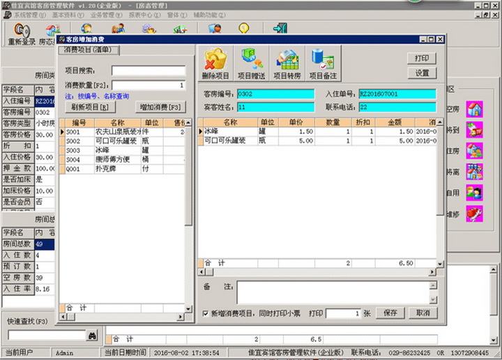 ●“增加消费”登记入住的客房,消费其他商品和服务信息。