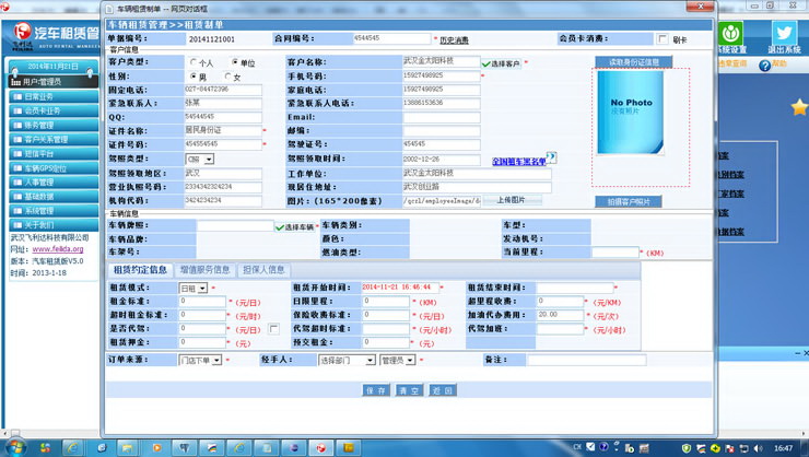 6) 系统具备灵活的外部设备接入功能,如PDA拍照验车、收车,自动导入电脑随同出车单进行打印;第二代身份证信息自动读入,无需人工录入客户信息;短信群发通道的接入,发送客户生日祝福,公司优惠活动信息等;规模化业务受理,自动弹出客户信息提升客户服务质量。
