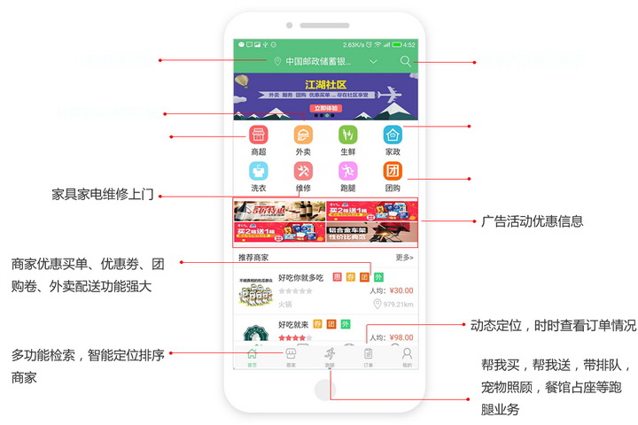 还要说明一点的是江湖商圈O2O系统目前是最新的智慧城市O2O系统,它是集团购、跑腿、维修、商城、家政、美食、外卖、商超等一体化便民服务,PC端+APP端一应俱全。(手机APP端体验包括用户端、商家端和配送端)从生活习惯出发,落实到系统细节优化。功能应用始终围绕“生活商圈”进行优化升级,从而达到提高用户体验感受目的。