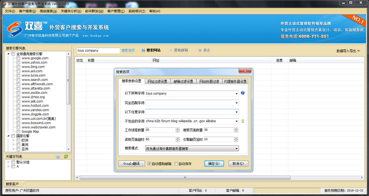 双喜外贸客户搜索与开发系统,集合全球各大主流商业搜索引擎,及全球各国当地常用的区域引擎,利用产品及目标客户群的特征设置相应的关键词,通过这些搜索 引擎来搜索定位到目标客户的官方网站、提取联系方式,将全球有意向的行业客户都搜索出来,帮助外贸企业在快速成交一些订单的同时,还可以培养一批忠诚的合 作伙伴。
