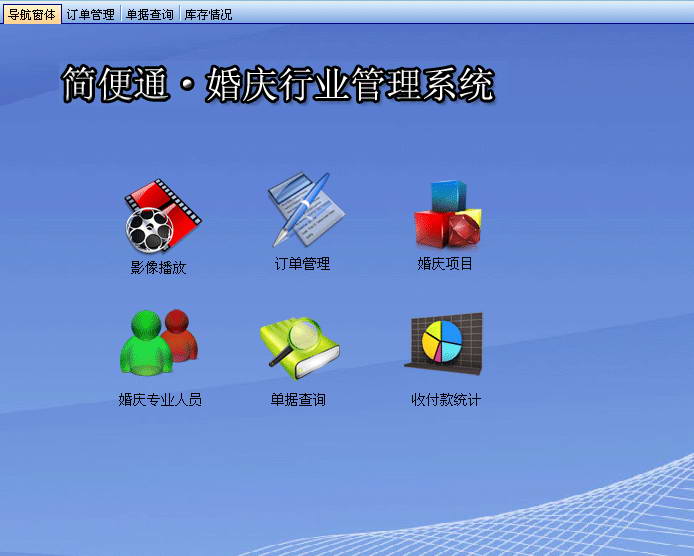 本软件完全结合婚庆公司业务实际,在对外音视频动态展示与宣传,日常的洽谈,跟单,签单,婚礼服务,以及日常业务资费收支管理等方面具有强大的管理功能,完全满足婚庆公司的业务需要。
