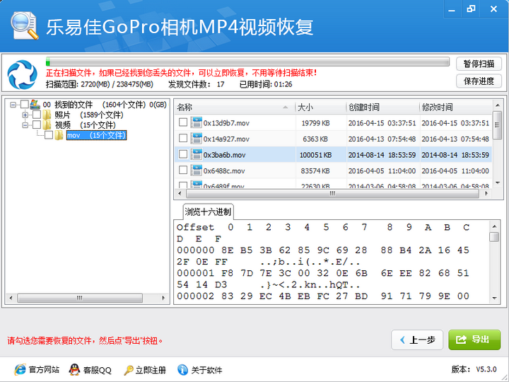 3楼 华军网友 2021-11-05 06:43:05乐易佳GoPro相机MP4视频数据恢复软件功能全面,使用也挺方便的。