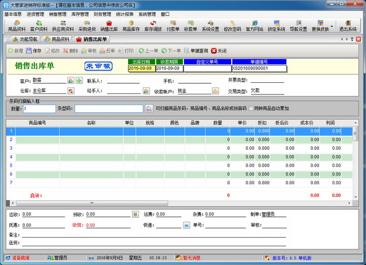 一、基本功能:进货入库、进货退回、销售出库、销售退货、报损、报溢、分库调拨(支持异价调拨)、拆零、组装、盘点、收款、付 款、预收、预付、收入、支出、成本、利润核算等。