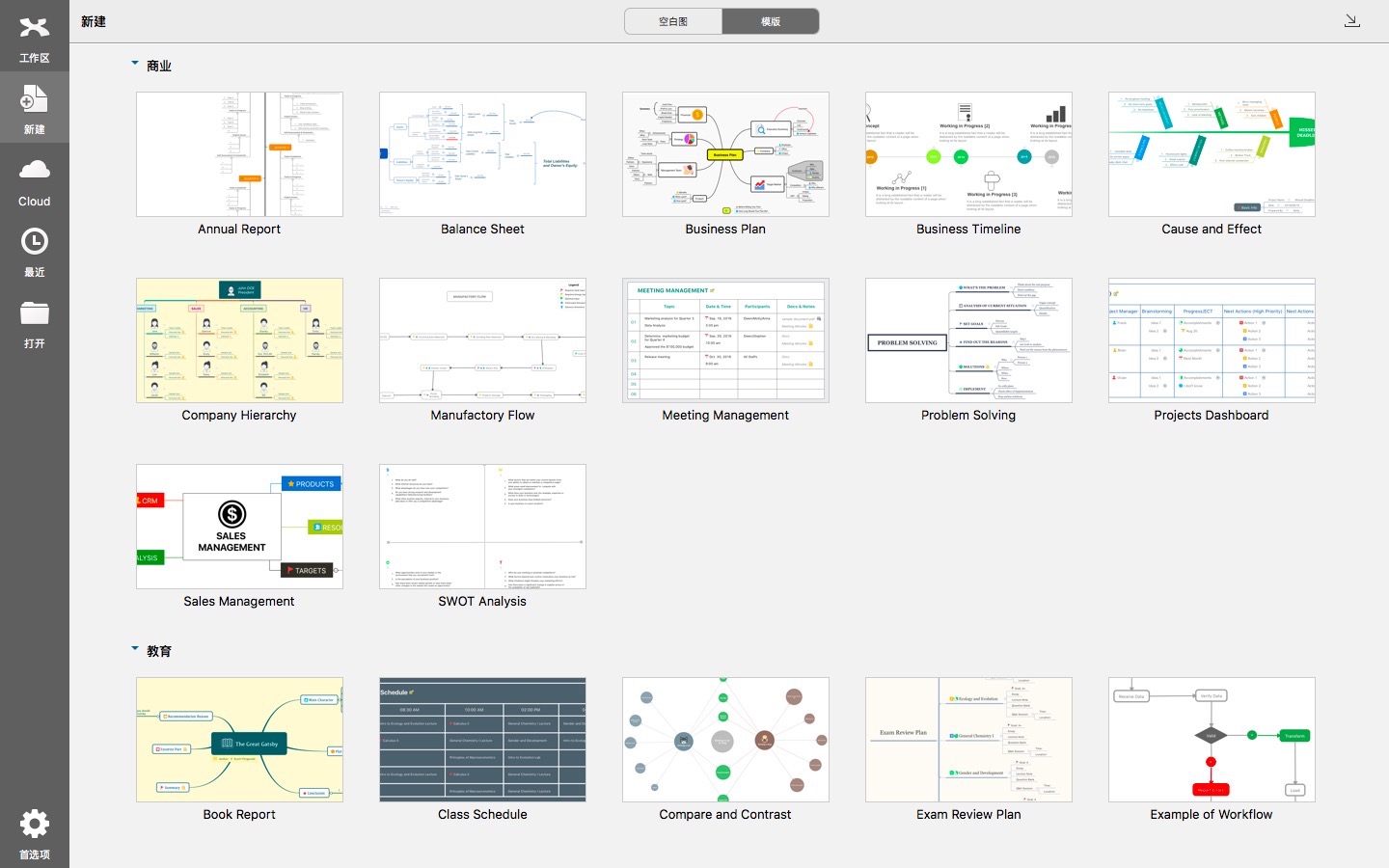 每次打开XMind,您都可以看见全新的主页控制面板。通过面板,您可以选择导图结构、选择一个漂亮的主题风格、打开最近使用的文件来创建思维导图。