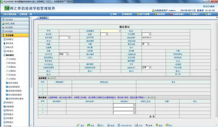 师之伴侣专业版是一套专业的培训学校管理软件,非常适用于各种职业技能类培训学校。该软件包括教职工管理、教材管理、教学管理、学员管理、住宿管理、考证管理、就业管理、物品管理和财务管理等九个主要业务模块,覆盖了培训学校日常管理的各个环节和要素。该软件界面直观、操作方便、内容全面、功能强大,是一套优秀的专业性培训管理软件。