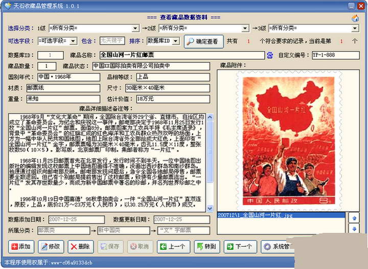 > 1、查看藏品数据:软件启动后自动进入查看藏品状态,用户可以通过选择藏品分类、藏品某个字段包含的关键字、排序方式等检索条件并点击“确定查看”按钮进行数据库检索查看,并可通过点击“上一个”、“下一个”、“转到”等按钮查看所有或指定的检索结果记录的藏品数据。如果藏品包含附件,一般的图片文件(如JPEG等格式)可以直接显示,其它类型的附件文件则显示为文件类型图标。用鼠标双击附件图片或图标可调用操作系统默认程序打开附件文件。如果藏品包含多个附件,可通过附件列表来选择分别查看。