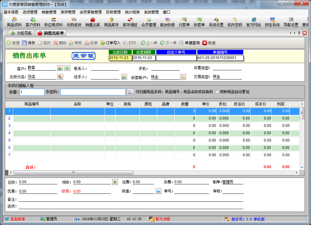 大管家商品销售管理软件是一款专业的销售管理软件,其中包含商品销售管理系统 ,库存管理系统(仓库管理系统),财务和报表系统等子模块。软件界面设计简洁,美观,其人性化的软件流程,使普通用户不需培训也能很快掌握软件操作使用方法,上手极易。强大报表与集成查询功能是本软件的最大特色,所有功能在用户需要的使用地方自然体现,不用打开多个窗口重复查询。适用于商贸公司,个体门店等用于商品销售管理, 库存管理,财务管理等,客户管理,员工管理等场合,是您企业进行信息化管理的强大工具。适用于商贸公司、批发零售等行业、店铺,连锁分店以及个人销售管理等。