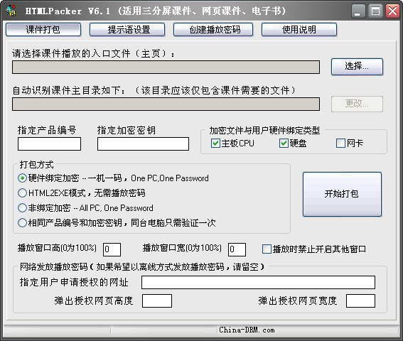 HTMLPack,又名HTML2EXE或Web2EXE,可以将html网页打包成exe,将HTML页面或整个网站打包加密在一个压缩格式的EXE文件里,并可以根据用户的电脑进行授权浏览,页面中的文字、动画、图片等无法复制和下载;支持Frame ,动态GIF,多媒体播放,背景声音,Flash,网页动画,Javascript等。 您可以利用本软件制作基于HTML格式的电子书。
