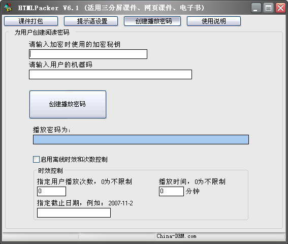 3、增加了试播文件制作功能,您可以为用户制作试播文件,并可以控制文件的播放次数和有效期,无需播放密码;