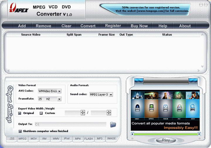 1楼 华军网友 2011-09-09 12:36:27Apex Video To MPEG VCD DVD Converter很好用,谢谢啦!!