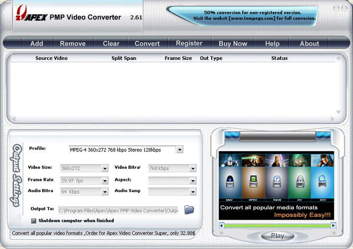 1楼 华军网友 2012-08-04 20:36:20Apex PMP Video Converter很好用,谢谢啦!!