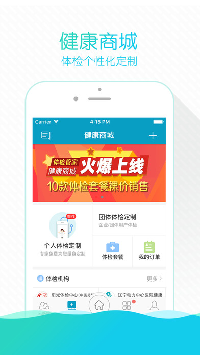 【健康商城】体检购买和预约。个性化的体检定制:专业医生团队跟根据您的身体状况量身定制体检方案,让体检更可续,杜绝过度体检。商城:丰富的体检套餐裸价销售,总有一个套餐产品适合您,线上购买和预约,线下体检,打造完美体验。