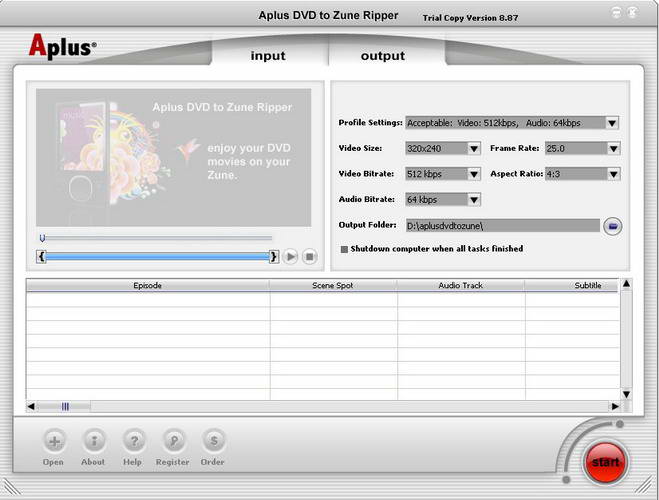 2楼 华军网友 2014-12-05 10:12:33Aplus DVD to Zune MP4 Ripper界面设计很容易上手,功能很丰富,本人极力推荐!