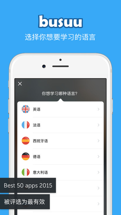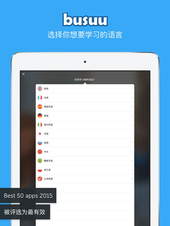 借助 busuu 免费应用,您可以学习、练习和提升下列语言的基础知识:西班牙语、英语、德语、法语、意大利语、日语、葡萄牙语、波兰语、中文、俄语或土耳其语。
