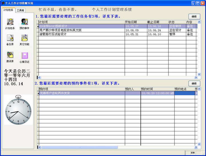 1楼 华军网友 2017-05-07 10:18:33工作提醒系统(个人OA)界面设计很容易上手,功能很丰富,本人极力推荐!