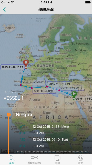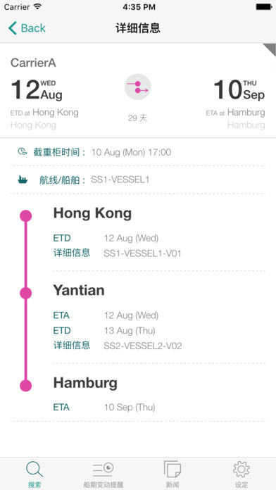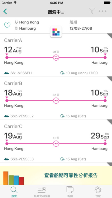 同时比较多达3条船期包括承运人到港的准时性,选择最佳航线。
