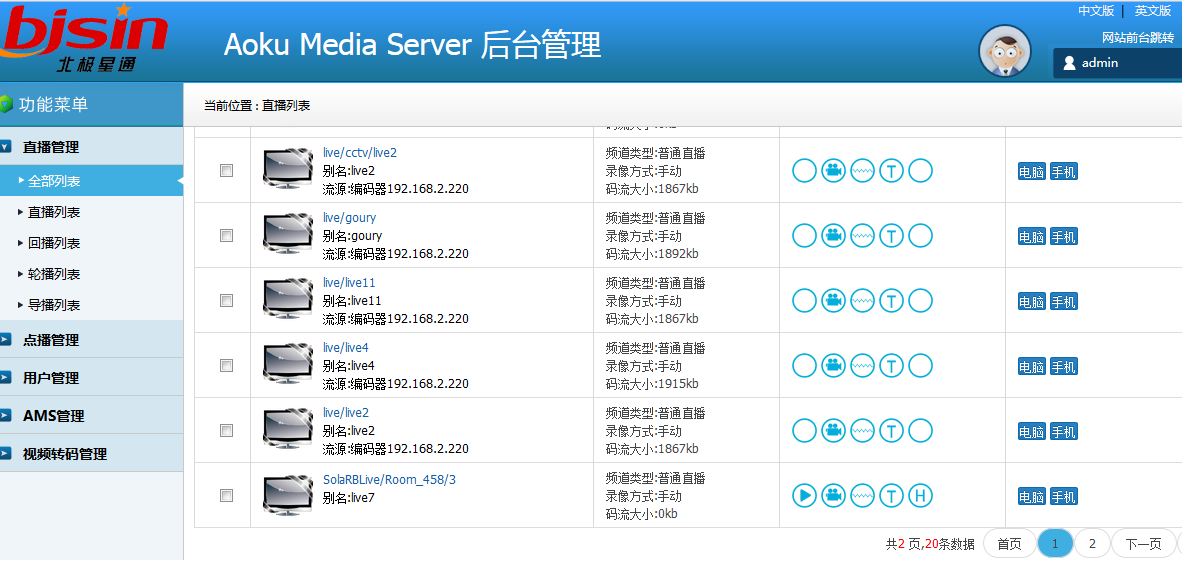 Aoku Media Server是北京北极星通信息技术有限公司独立研发的流媒体服务系统,它能够运行在Windows,linux,android等系统平台上,单服务器可支持3000个以上的并发用户访问。