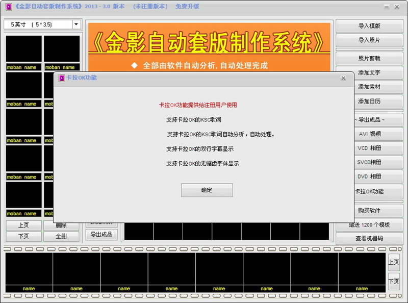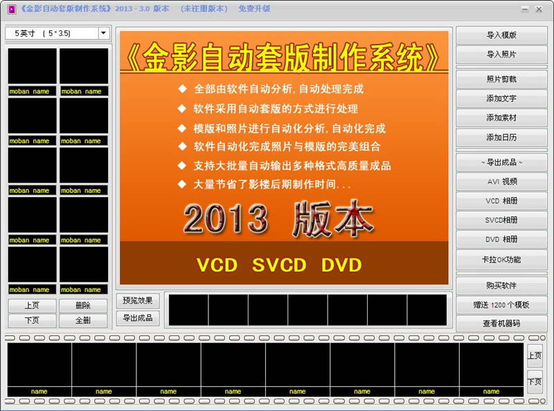 《金影自动套版制作系统》软件是一款自动套版软件,是影楼后期制作必备软件。软件采用自动套版的方式,对导入的模版和照片进行自动化分析,自动化完成照片与模版的完美组合。您要做的只是把模版和照片导入到软件中,其它的工作全部由软件自动分析,自动处理完成,大量节省了影楼后期制作时间。软件支持大批量自动套入模版,自动套入照片,大批量自动输出高质量成品,只需短短的时间就可以输出数本相册。