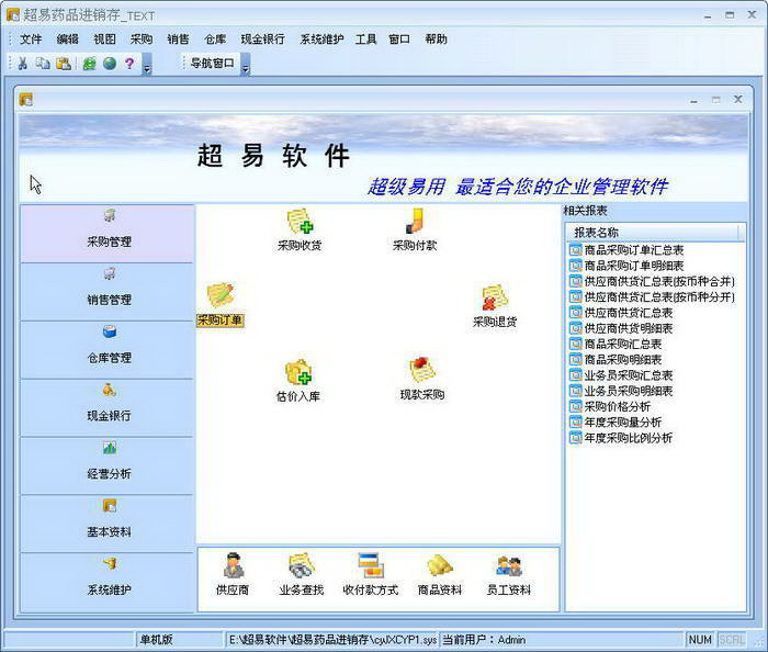 超易药品进销存软件主要分为销售管理,采购管理,仓库管理,财务管理,基本资料,系统设置(权限管理)五大部分主要功能包括:
