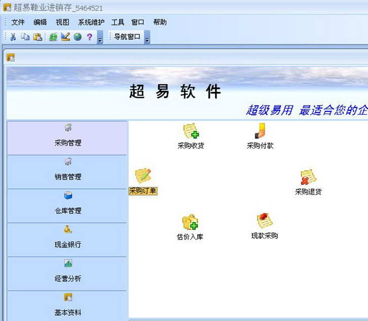 超易鞋业进销存软件主要分为销售管理,采购管理,仓库管理,财务管理,基本资料,系统设置(权限管理)五大部分主要功能包括: