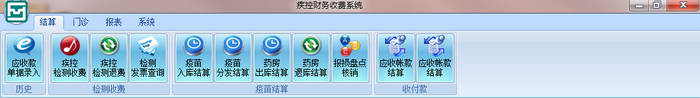 历史应收款单据录入、疾控检测收费、疾控检测退费、疾控收费发票查询、疫苗入库结算、疫苗分发结算、药房(二级直属库)出库结算、药房退库结算、报损盘点核销、应收帐款结算、应付帐款软件等。