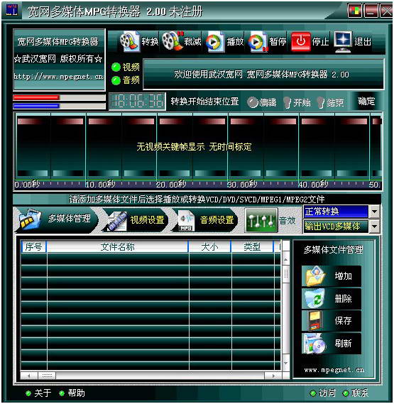 宽网多媒体MPG转换器是武汉宽网开发用于从多媒体文件中可视化显示提取音视频并转换产生VCD/SVCD/DVD/MPEG1/MPEG2文件的软件, 该软件支持多种多媒体类型,包括MP4/3GP /MTV/AMV/VCD/DVD/SVCD /MPEG1 /MPEG2 /MPEG2 TS /AVI(含 DIVX XDIV H263 H264 MJPG MPNG等视频编码)/微软 (ASF、WMA、 WMV) /RealPlay(RM、RMVB) 及 QuickTime(MOV 、QT)/FLASH(FLV、SWF)等多媒 体文件,同时提供音频效果调整、裁减、快速转换以及输出音视频参数调整等功能,是多媒体转换VCD/SVCD/DVD/MPEG1/MPEG2的理想工具 (FLV转VCD SWF转VCD VCD转 DVD AVI转 VCD MTV转VCD 3GP转VCD MP4转DVD AVI转MPEG AVI转 DVD FLV转DVD、FLV 转 MPEG RMVB转DVD、RMVB转VCD等)。