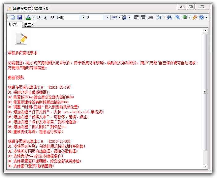 1楼 华军网友 2013-05-01 18:59:26华联多页面记事本很好用,谢谢啦!!