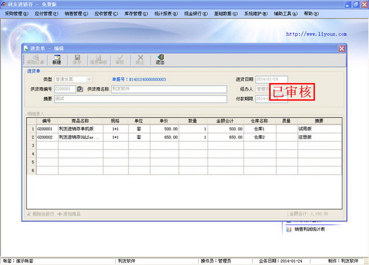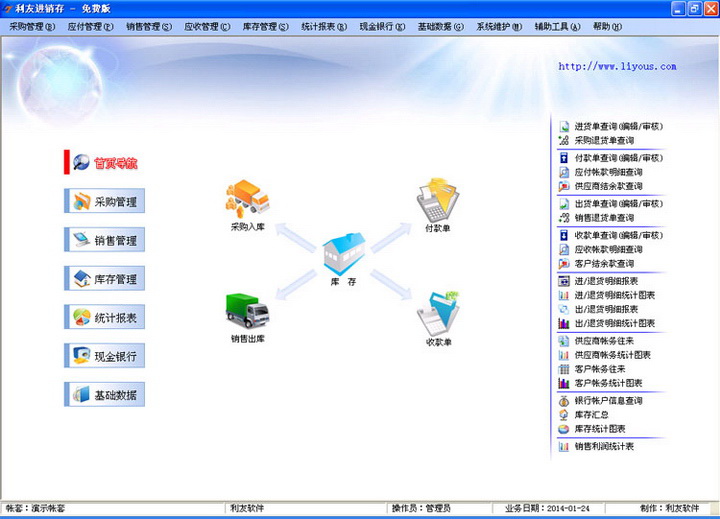 利友进销存是一款通用的中小型企业进销存财务四位一体的专业级企业管理软件。系统以进销存业务为基础,整个系统一体化设计,主要包括采购管理、应付管理、销售管理、应收管理、库存管理、统计报表、基础数据、系统维护等八大模块,囊括了企业进、销、存、财务管理的全过程。是一款专门为国内中小型企业的货品进销存管理而开发的软件。系统采用导航式界面,为用户提供了直观而快捷的操作模式,还提供多种统计报表,同时提供丰富的实时查询统计功能。是一套通用性、实用性较强的企业进销存管理系统。使用本软件,会使您企业的货品进销存管理工作变得有条有理,让您的企业稳健发展。